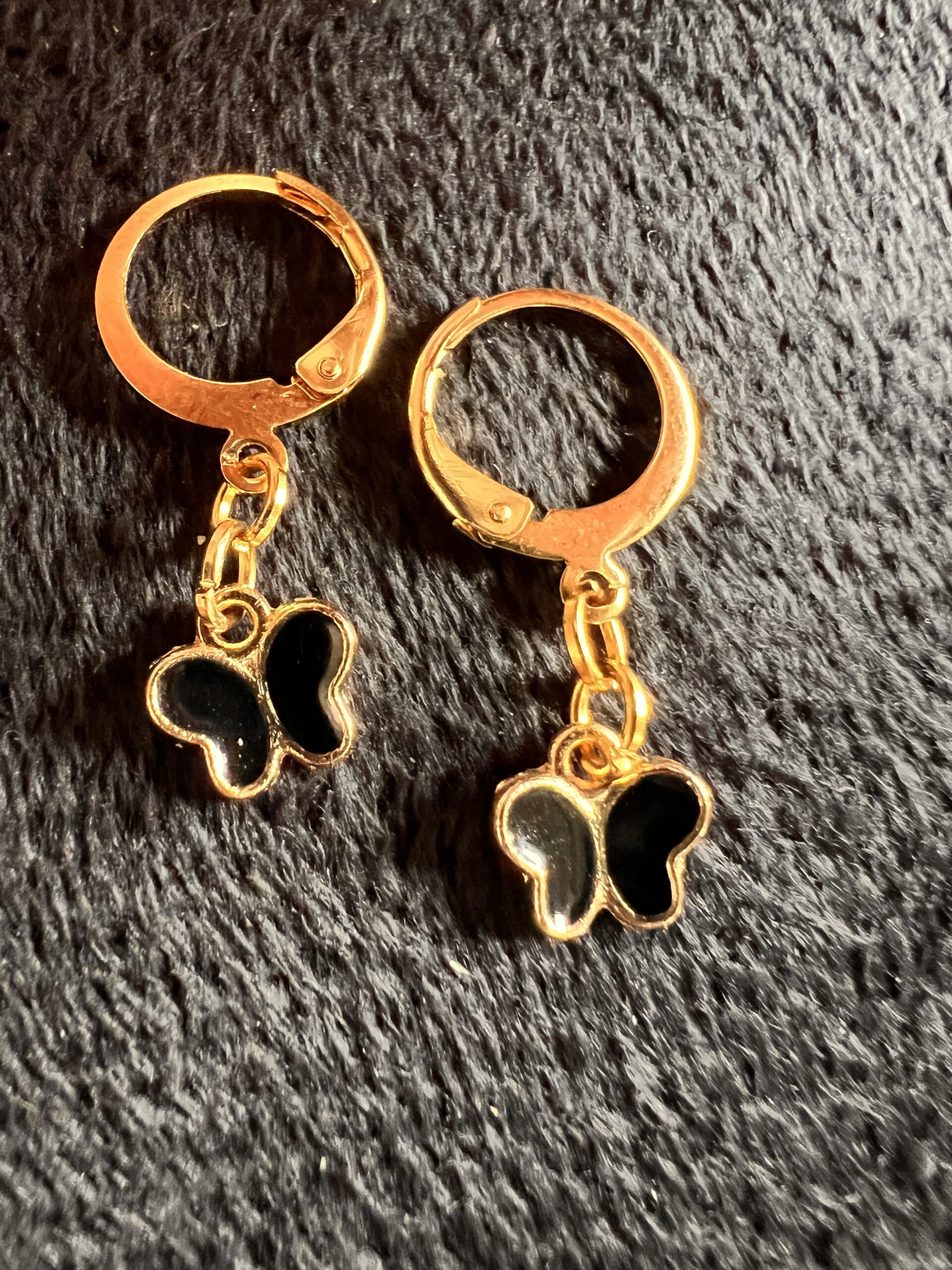 leuke vrolijke goudkleurige oorbellen met vlinder hanger in de kleur zwart.